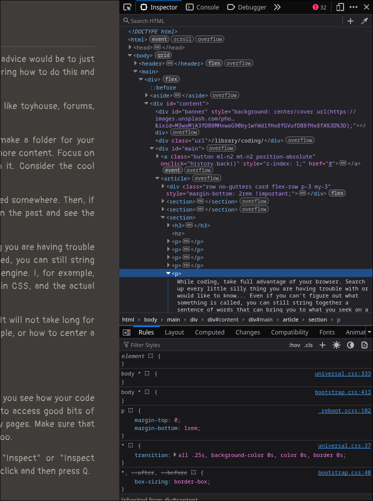 With this you can also look at cool elements you may see while surfing the web and see how it was created. Remember to always see if the webmaster allows direct inspiration! Also avoid directly copy-and-pasting code unless the author directly endorses it.